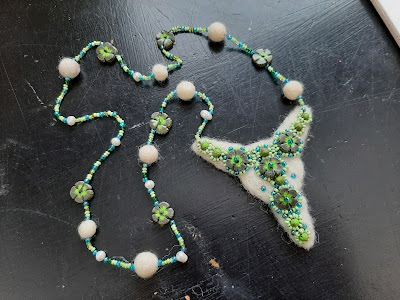 Innostuin sitten yhdistämään huovutuksen ja korun. Tuo valkoinen pohja on siis huovutettu ja huovutin myös muutaman pallon. Kukkashelmet olen tehnyt Fimo massasta.